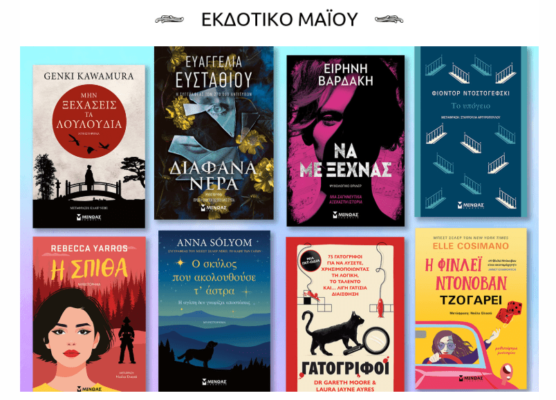 Με χαρά σας παρουσιάζουμε το πρώτο μέρος του πλούσιου εκδοτικού προγράμματόςτων εκδόσεων Μίνωας, γεμάτο σασπένς, ανατροπές αλλά και ρομαντικές ιστορίες, διλήμματα και προκλήσεις που απαιτούν από τους χαρακτήρες δύσκολες αποφάσεις.